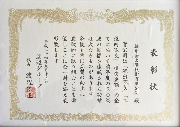 錦州金太陽技術有限公司は、株式会社渡辺製作所によって2001年8月に中国に設立された板金の設計・加工、技術サービスを従事する子会社です。